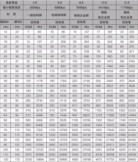 相信許多用戶在選購(gòu)液壓扭矩扳手之前都看過(guò)液壓扳手扭矩對(duì)照表,液壓扳手扭矩對(duì)照表其實(shí)就是螺栓扭矩值推薦表,它主要被用來(lái)查詢螺栓螺母的強(qiáng)度等級(jí)、材質(zhì)和螺栓大小扭矩值的一張表格,能夠更好的幫助用戶選擇合適的扳手型號(hào),下圖就是液壓扳手扭矩對(duì)照表。