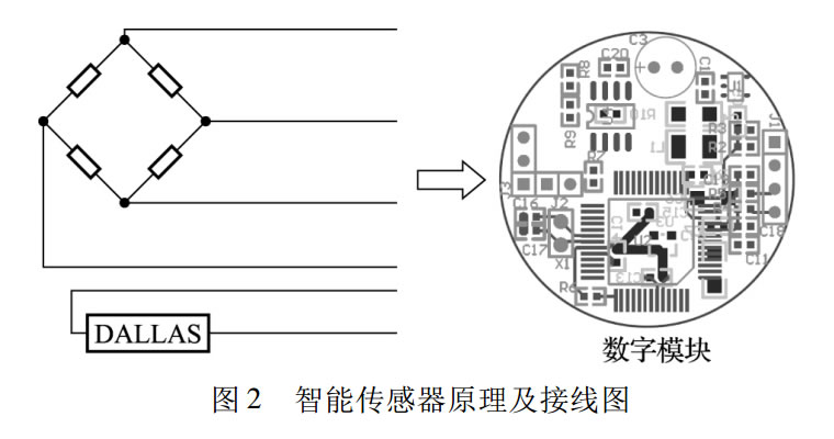 將模擬應(yīng)變式傳感器經(jīng)過組橋后直接將電橋的電壓模擬信號接入單片機 CS5530 的模擬輸入端,通過 CS5530的A/D 轉(zhuǎn)換器將電壓信號轉(zhuǎn)換成數(shù)字信號, 單片機對時鐘電路、復(fù)位電路、電源電路、串行通訊模塊、存儲模塊進行控制,通過編程處理后按照一定的格式將數(shù)據(jù)通過 RS485 串行通訊接口輸出。采用DALLAS2401半導(dǎo)體芯片。該芯片在工廠生產(chǎn)時,刻入經(jīng)檢測的64位注冊碼(8位家族碼+48位序列碼+8位CRC校驗碼),因此可以保證沒有任何兩個器件的注冊碼是相同的。采用低成本 TSOC 表面貼封裝,方便裝在傳感器插頭或接線腔中。原理圖如圖2所示。