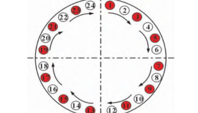 如上圖24路螺栓法蘭50%螺栓拉伸器覆蓋編號(hào)圖我們可以看出,螺栓依然是依次編號(hào),只不過在安裝螺栓拉伸器時(shí)是總數(shù)分為兩組,隔一顆安裝,總體覆蓋便可以達(dá)到50%也就是12顆。安裝好之后按步驟拉伸即可。如此可知,24路螺栓法蘭25%的螺栓覆蓋需要做到6同步編號(hào),也就是6組4個(gè)號(hào),先均分為6個(gè)點(diǎn)標(biāo)“1”,再取間隔之中為“2”,依次取中編“3”,編“4”,編完即可。拉伸時(shí)按照編號(hào)分次拉伸。